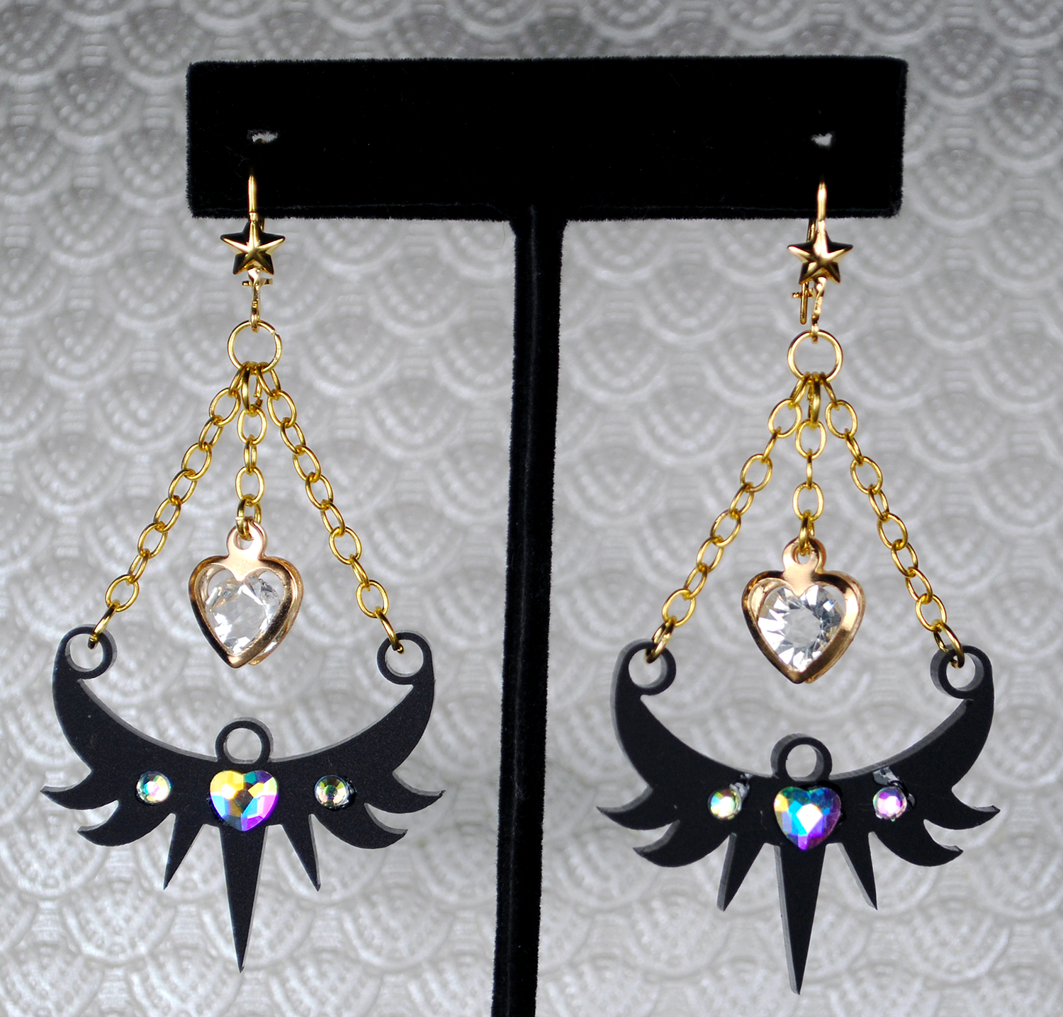 Earrings feature crystal and original laser cut pieces.